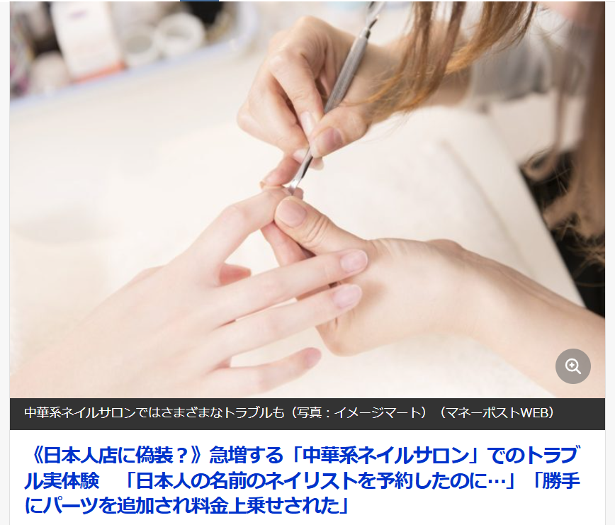 隨著觀光客需求增加,加上越來越多中國人希望在日本工作,中華系美甲沙龍在東京持續擴張。然而,有些沙龍會偽裝成「日本人店家」、私自更改預約內容並高額收費等,引發不少糾紛。對顧客來說,選擇值得信賴、公開透明的店家尤為重要。